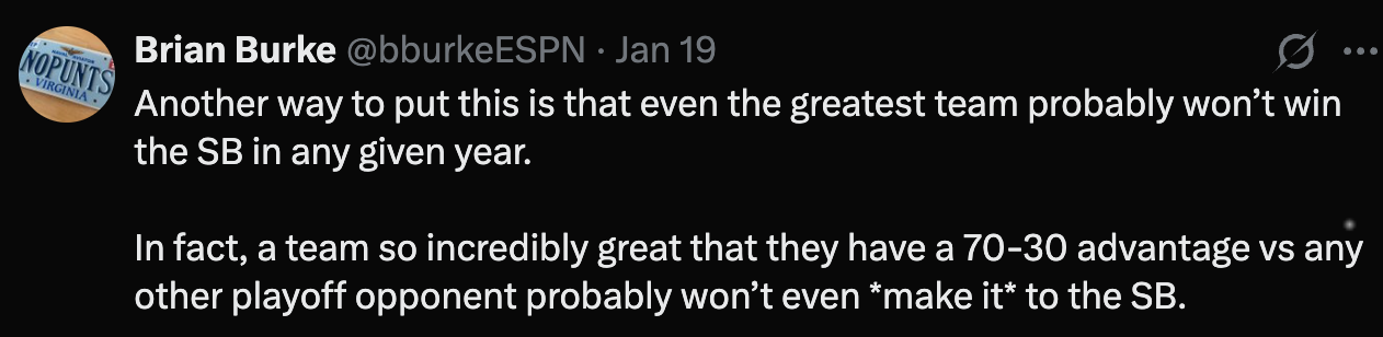 The truth is much more nuanced. People can call it a “loser mentality” or an excuse, but the fact of the matter is, the NFL playoffs are extremely high variance. Randomness plays a big role in deciding the outcomes of games whether people like it or not, something Brian Burke of ESPN discussed on X: