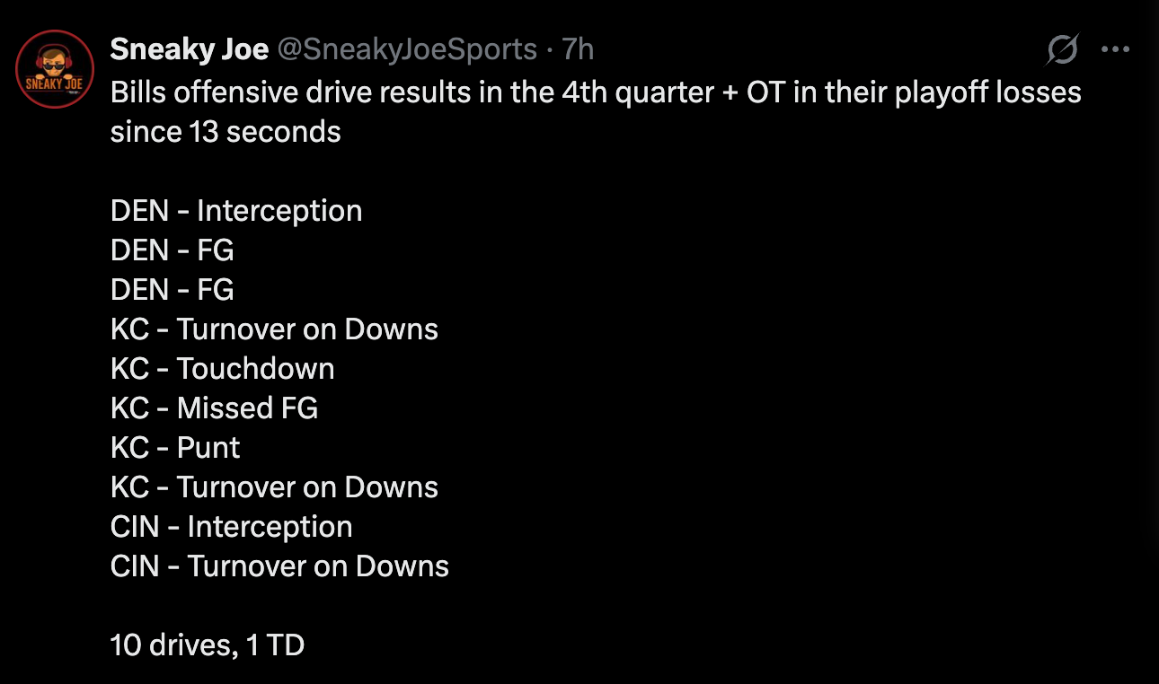 We are on three straight postseason losses and counting where the Buffalo offense has had the ball down 3 or tied at the end of games and failed to win it.